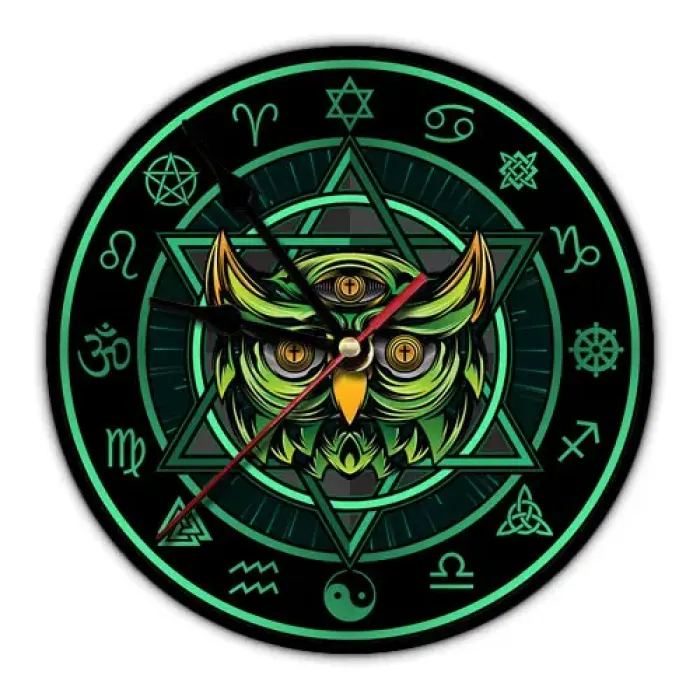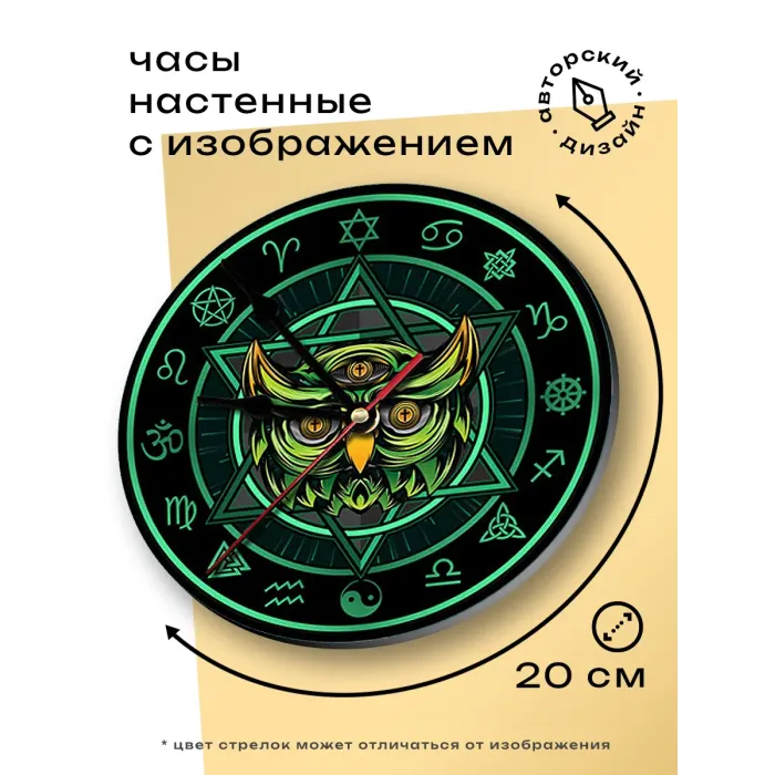Настенные часы с изображением совы. Циферблат изготовлен из вспененного пластика ПВХ, дизайн нанесён методом наклейки.