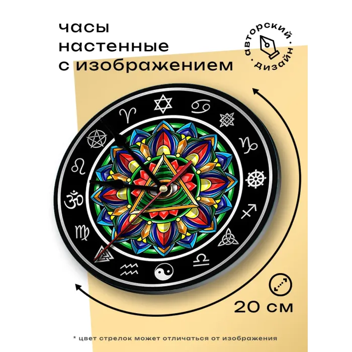 Настенные часы 'Всевидящее око' — это оригинальный элемент декора, который добавит загадочности и стиля в любое помещение. Циферблат диаметром 20 см выполнен из лёгкого вспененного пластика ПВХ, что делает его прочным и долговечным. Удобная петля позволяет легко повесить часы на стену, а метод нанесения изображения с помощью наклейки обеспечивает яркость и четкость дизайна. Часы упакованы в картонную коробку, что делает их идеальными для подарка или личного использования. Обратите внимание: батарейка АА в комплект не входит.
