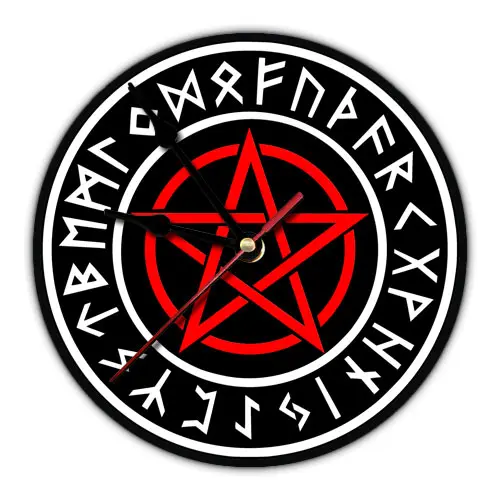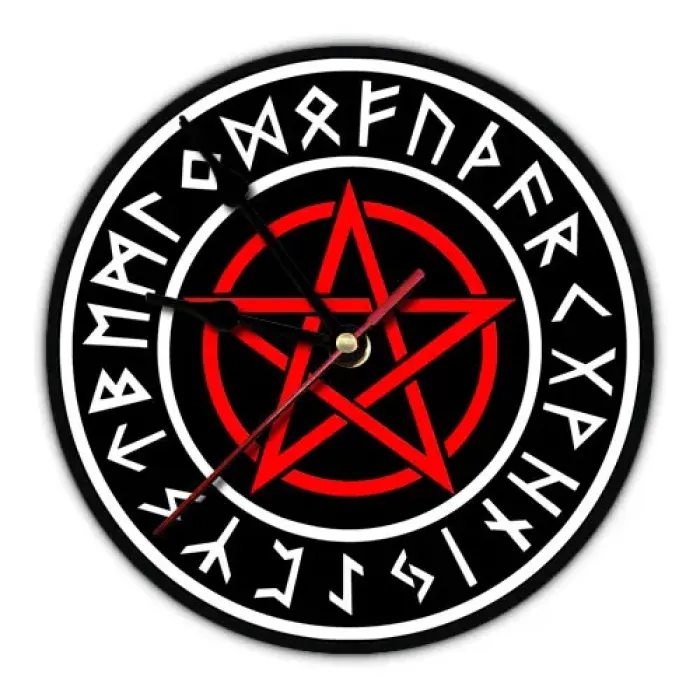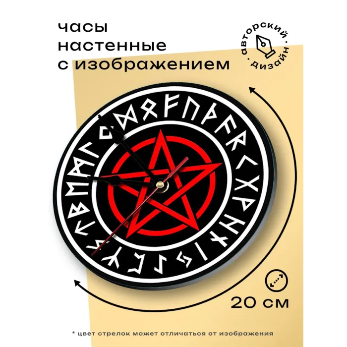 Настенные часы с изображением пентаграммы. Циферблат диаметром 20 см выполнен из вспененного пластика ПВХ, имеет петлю для подвешивания.