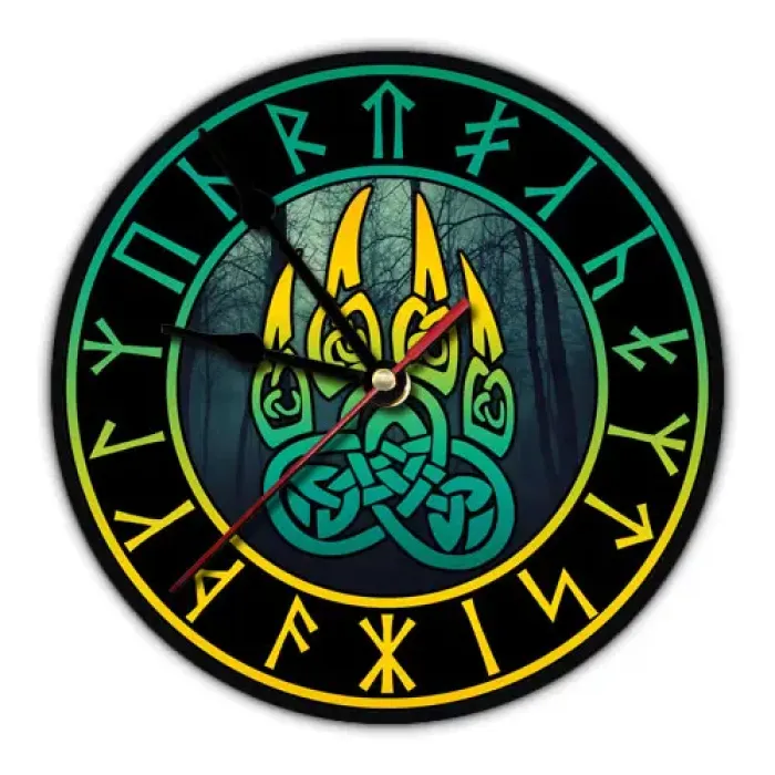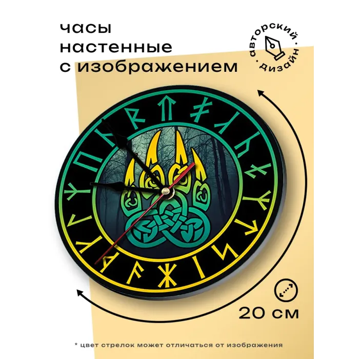 Настенные часы с дизайном «Печать Велеса». Циферблат диаметром 20 см выполнен из вспененного пластика ПВХ, оснащён петлёй для подвешивания.