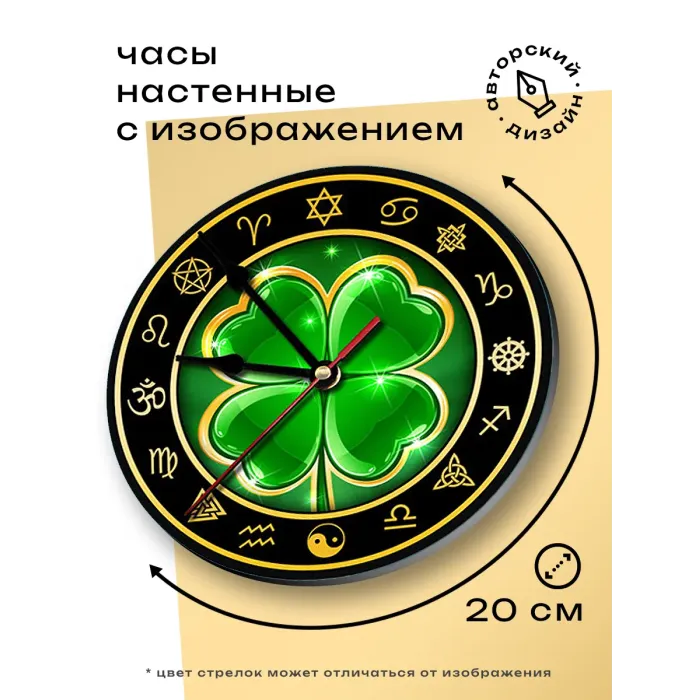 Настенные часы "Клевер удачи" — это не только практичный элемент интерьера, но и символ везения. Циферблат диаметром 20 см выполнен из легкого вспененного пластика ПВХ, что обеспечивает долговечность и стильный внешний вид. Удобная петля позволяет легко повесить часы на стену, а метод нанесения изображения с помощью наклейки придаёт им оригинальность. Часы упакованы в картонную коробку, идеально подходящую для подарка. Обратите внимание: батарейка АА в комплект не входит.