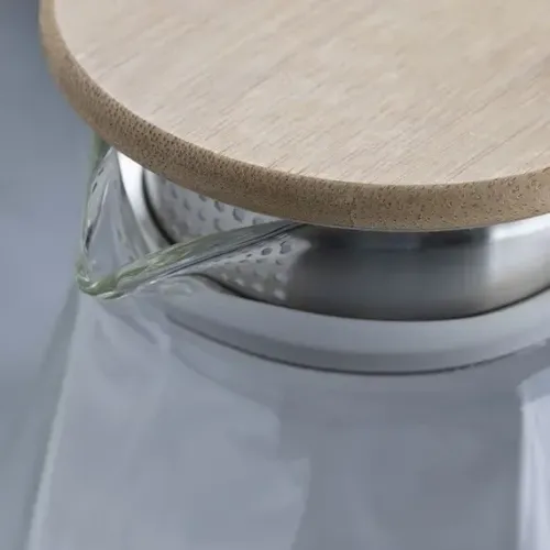 Корпус выполнен из термостойкого стекла, что обеспечивает прочность и устойчивость к перепадам температур. Бамбуковая крышка плотно прилегает, сохраняя содержимое. Фактурная поверхность «Бриллиант» и контрастная ручка являются элементами дизайна.