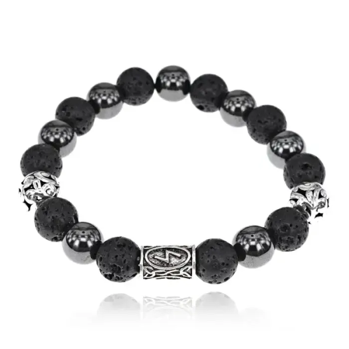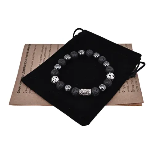 Магнитный браслет-сувенир из натурального камня лава и магнитного гематита с символом руны Соулу.