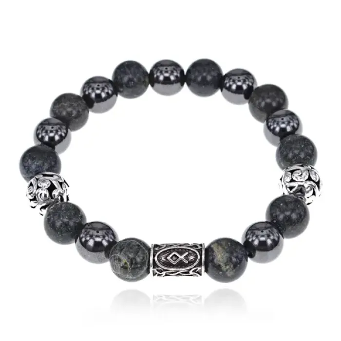 Магнитный браслет из натурального камня змеевик и гематита с руной Одал.