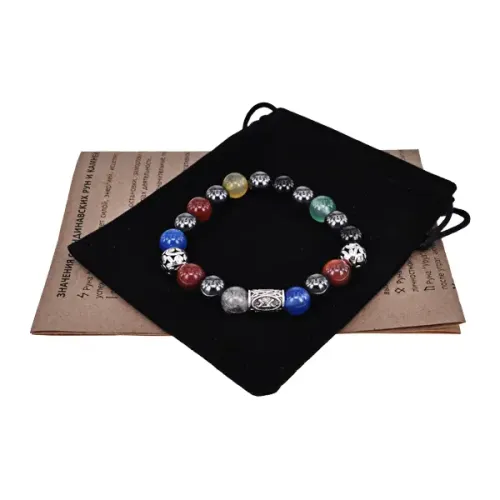 Размеры и комплектация: Внутренний диаметр браслета ~5.5 см, диаметр бусин 10 мм. В комплекте бархатный мешочек, буклет с описанием, упаковка — прозрачный пакет с еврослотом.