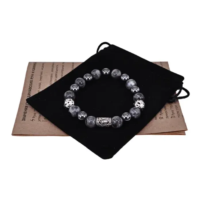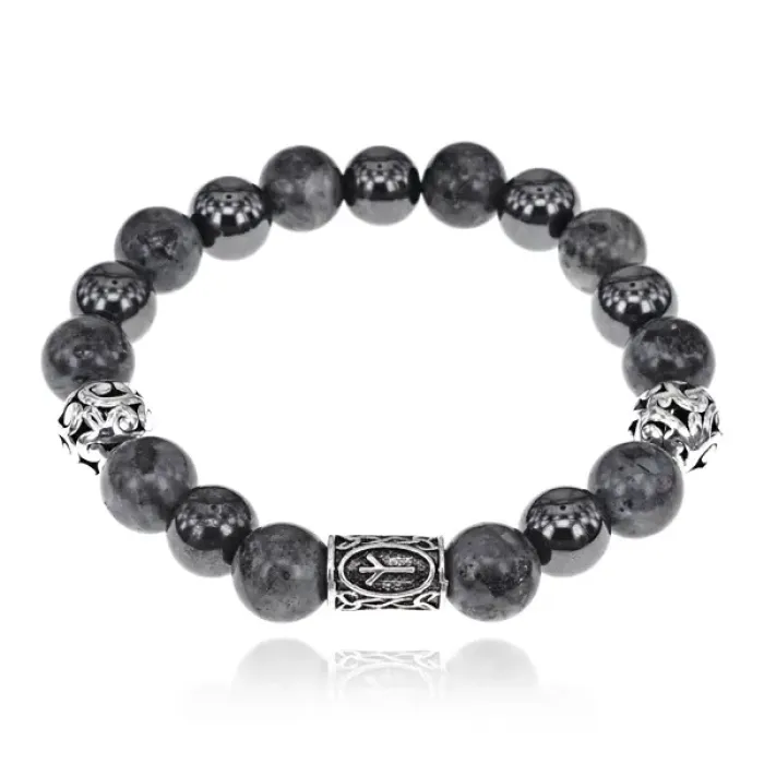 Магнитный браслет с руной Альгиз, выполненный из натурального камня лабрадор и магнитного гематита.