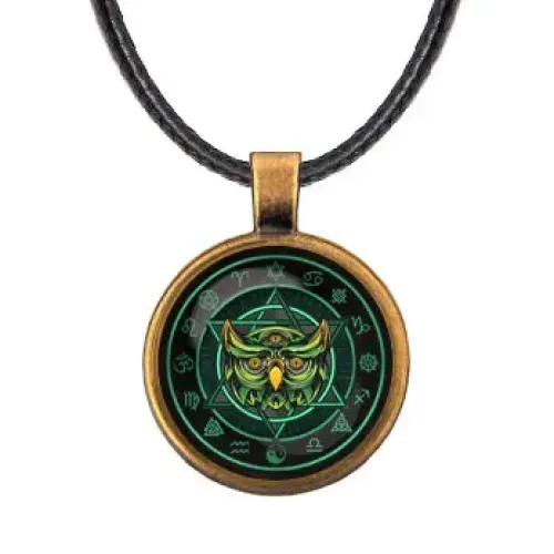 Кулон в виде совы из бижутерного сплава с покрытием под бронзу и стеклянным элементом.