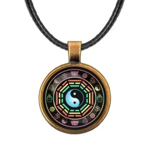 Кулон Ба-Гуа — сувенирный аксессуар из бижутерного сплава с покрытием под бронзу и выпуклой стеклянной линзой.