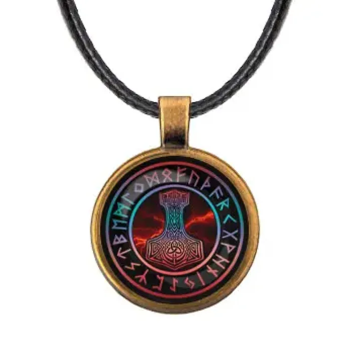 Кулон Молот Тора — это стильный аксессуар, который символизирует силу и защиту. Он выполнен из бижутерного сплава с покрытием под бронзу и дополнен стеклянной линзой, защищающей изображение. Диаметр кулона составляет 28 мм, что делает его заметным элементом в любом образе.