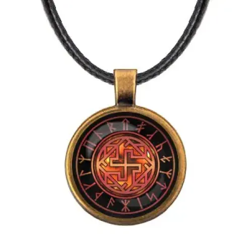 Кулон Валькирия — сувенирный аксессуар из бижутерного сплава с покрытием под бронзу и выпуклой стеклянной линзой.