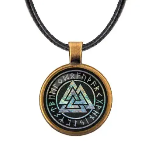Кулон Валькнут из бижутерного сплава с покрытием под бронзу и стеклянной линзой.