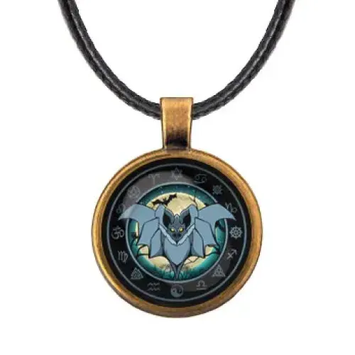Кулон из бижутерного сплава в виде летучей мыши с покрытием под бронзу и стеклянной линзой.