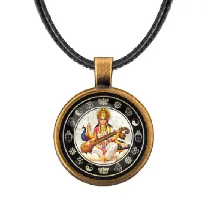 Сувенирный кулон с изображением Сарасвати из бижутерного сплава с покрытием под бронзу и выпуклой стеклянной линзой.