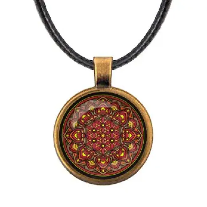 Кулон с символом «Цветок жизни». Изготовлен из бижутерного сплава со стеклянной линзой.