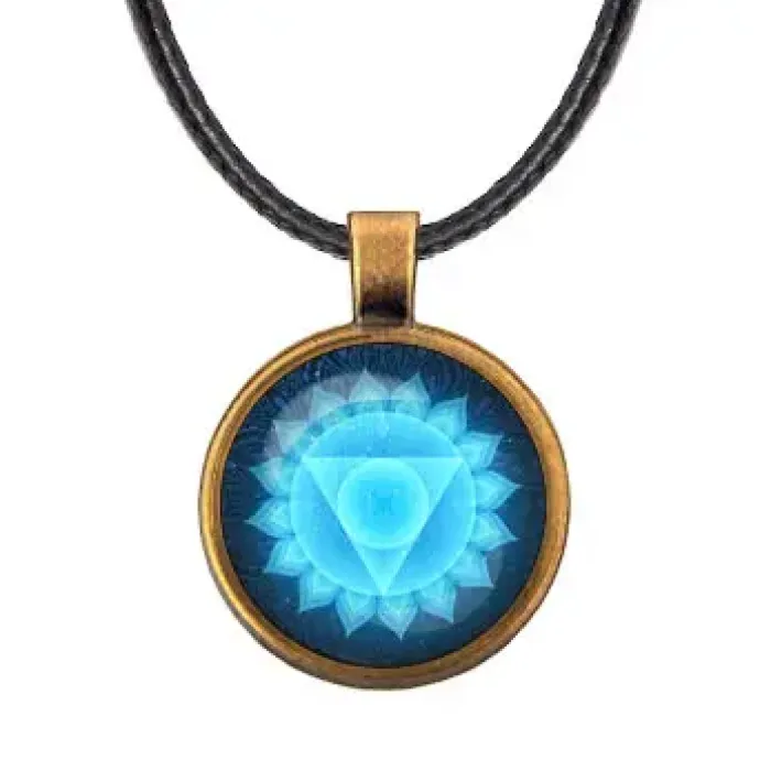 Кулон Вишуддха чакра — это стильный аксессуар, который не только украшает, но и символизирует гармонию и чистоту общения. Изготовленный из бижутерного сплава с покрытием под бронзу и стекла, он станет прекрасным дополнением к любому образу.