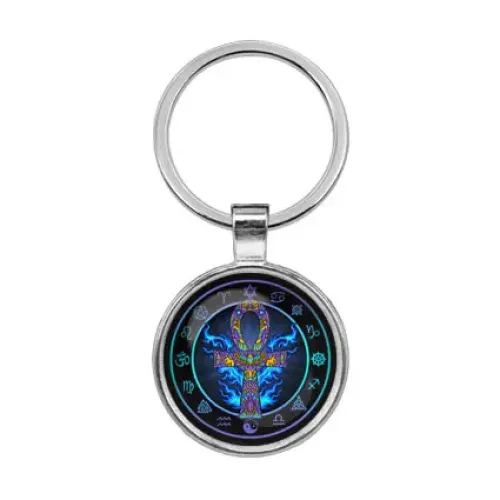 Брелок в виде символа анкх из бижутерного сплава со стальной основой и стеклянной линзой.