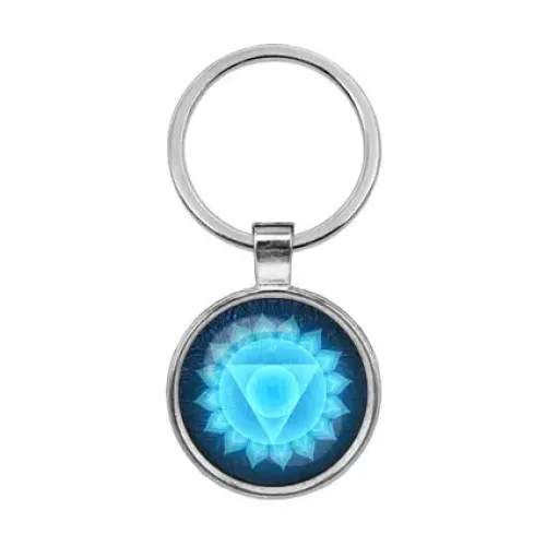 Брелок Вишуддха чакра из бижутерного сплава, стали и стекла с выпуклой защитной линзой.