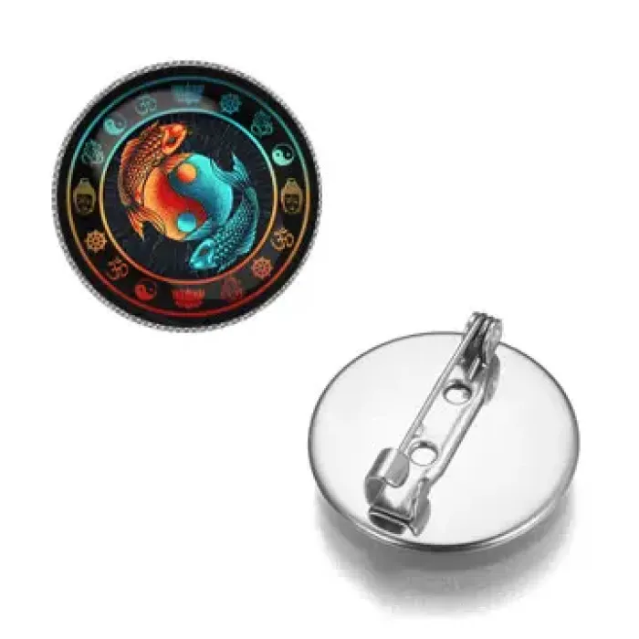 Значок из бижутерного сплава с изображением символа Инь-Ян в виде рыб, защищённым стеклянной линзой.