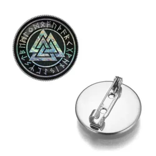 Значок Валькнут — сувенирный аксессуар из бижутерного сплава с покрытием под серебро. Изображение защищено выпуклой стеклянной линзой.