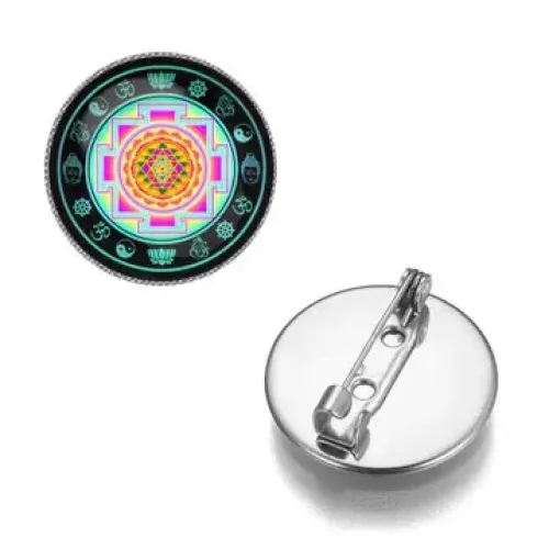 Значок с изображением Шри-янтры. Изготовлен из бижутерного сплава со стеклянной линзой.