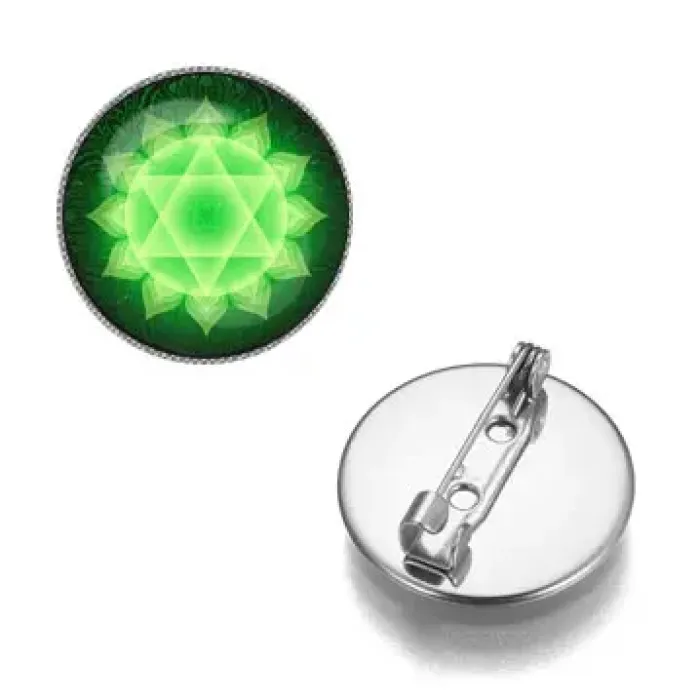 Значок с изображением Анахата чакры. Изготовлен из бижутерного сплава со стеклянной линзой.