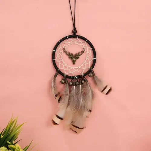 Интерьерная подвеска в виде ловца снов с фигурой оленя, декорированная бусинами, бубенцами и перьями.