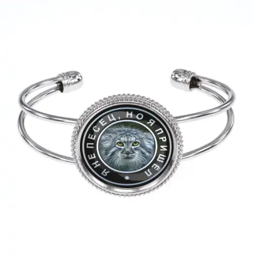 Браслет из бижутерного сплава с изображением манула под выпуклой стеклянной линзой.