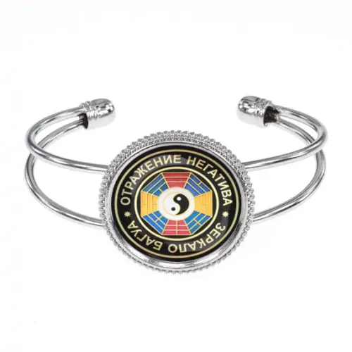 Браслет из бижутерного сплава с покрытием под серебро и стеклянной вставкой.