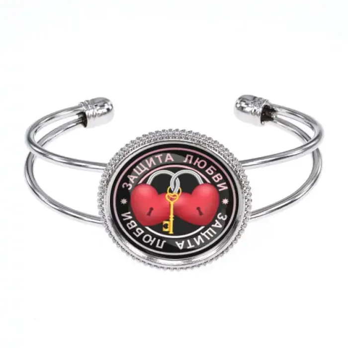 Браслет 'Защита любви' — это не только стильный аксессуар, но и символ верности и преданности. Он изготовлен из бижутерного сплава с покрытием под серебро и дополнен стеклянным изображением диаметром 25 мм, защищенным выпуклой линзой. Такой браслет станет прекрасным подарком для близкого человека или элементом собственного стиля. Упакован в прозрачный пакет, что делает его идеальным для подарка. Открытая форма позволяет носить изделие без ограничений по размеру.