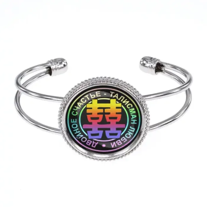 Браслет "Двойное счастье" — это стильный аксессуар, который символизирует гармонию и радость. Изготовленный из бижутерного сплава с покрытием под серебро и стекла, он станет прекрасным дополнением к любому образу.
