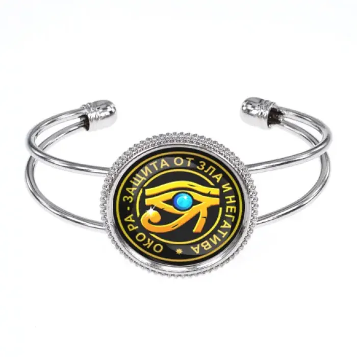 Браслет с символом Око Ра. Изготовлен из бижутерного сплава с покрытием под серебро, содержит стеклянные элементы. Центральный элемент — изображение глаза диаметром 25 мм под выпуклой стеклянной линзой.