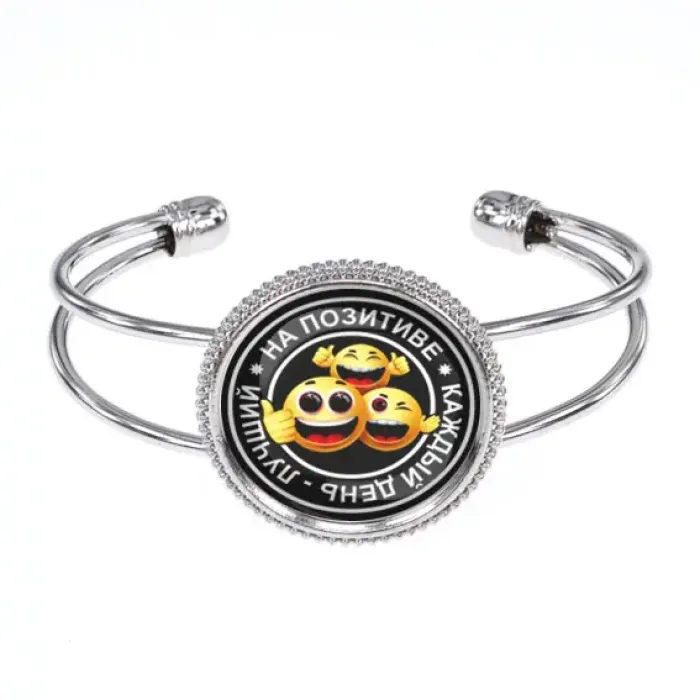 Браслет На позитиве — это стильный аксессуар, который поднимает настроение и добавляет ярких красок в повседневный образ. Изготовленный из бижутерного сплава с покрытием под серебро и стекла, он сочетает в себе прочность и элегантность. Изображение диаметром 25 мм защищено выпуклой стеклянной линзой, что делает его особенно привлекательным. Браслет имеет открытую (безразмерную) форму, что позволяет легко носить его на любой руке. Упаковка в прозрачный пакет придаёт изделию завершённый вид и делает его отличным подарком для близких.