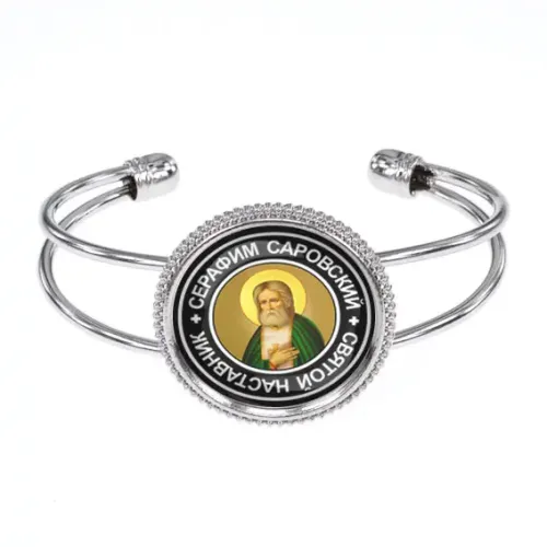 Браслет Святой Преподобный Серафим Саровский — это стильный аксессуар, который сочетает в себе духовность и элегантность. Изготавливается из бижутерного сплава с покрытием под серебро и стекла, что придаёт ему особую привлекательность. Изображение диаметром 25 мм защищено выпуклой стеклянной линзой, обеспечивая долговечность и яркость деталей. Упаковка выполнена в виде прозрачного пакета, что делает его идеальным для подарка. Браслет имеет открытый (безразмерный) дизайн, подходящий для любого запястья. Этот аксессуар не только украшает, но и служит символом веры и благословения.