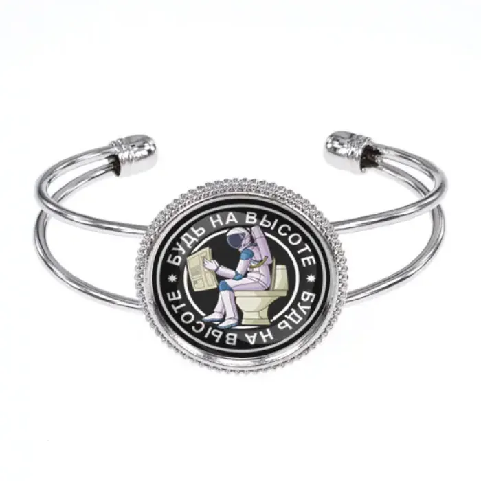 Браслет из бижутерного сплава с покрытием под серебро и стеклянной вставкой. Имеет открытую безразмерную форму.