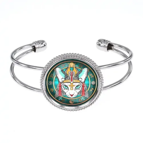 Браслет из бижутерного сплава с покрытием под серебро и стеклянным элементом в виде египетской кошки.