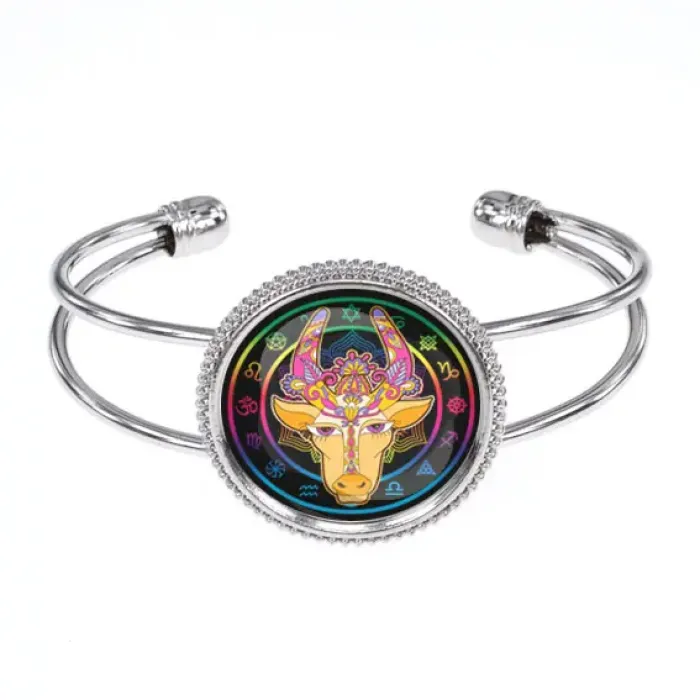 Браслет из бижутерного сплава с изображением священной коровы под стеклянной линзой.