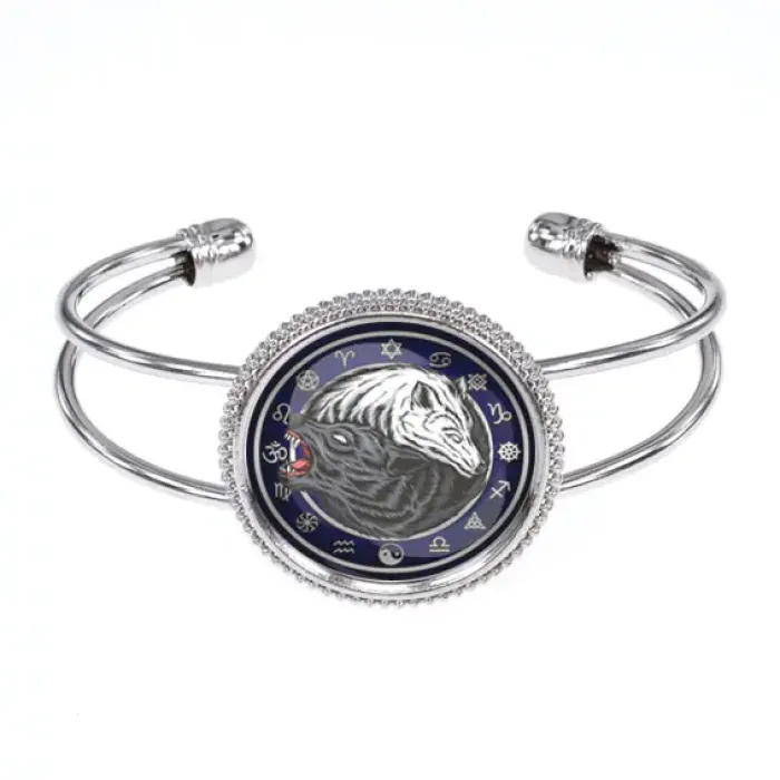 Браслет с символикой инь-ян и изображением волков. Изготовлен из бижутерного сплава и стекла.