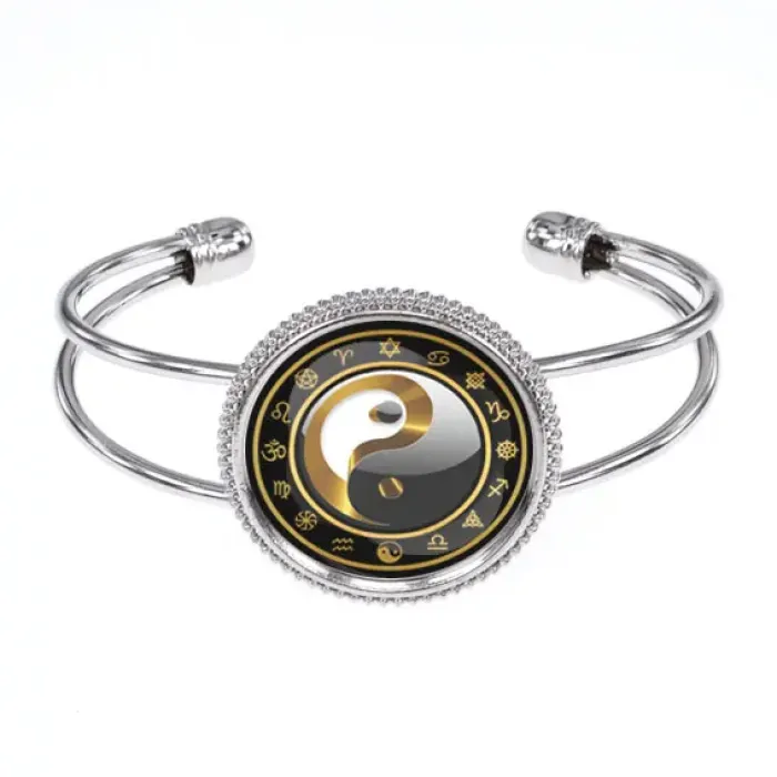 Браслет Инь-Ян — символ гармонии и баланса, который традиционно используется для привлечения положительной энергии. Изготовленный из бижутерного сплава с покрытием под серебро и стекла, этот аксессуар станет стильным дополнением к любому образу. Изображение диаметром 25 мм защищено выпуклой стеклянной линзой, что придаёт ему особую выразительность. Браслет имеет открытую форму, что позволяет носить его без ограничения размера. Упакован в прозрачный пакет, он также может стать прекрасным подарком для близких.