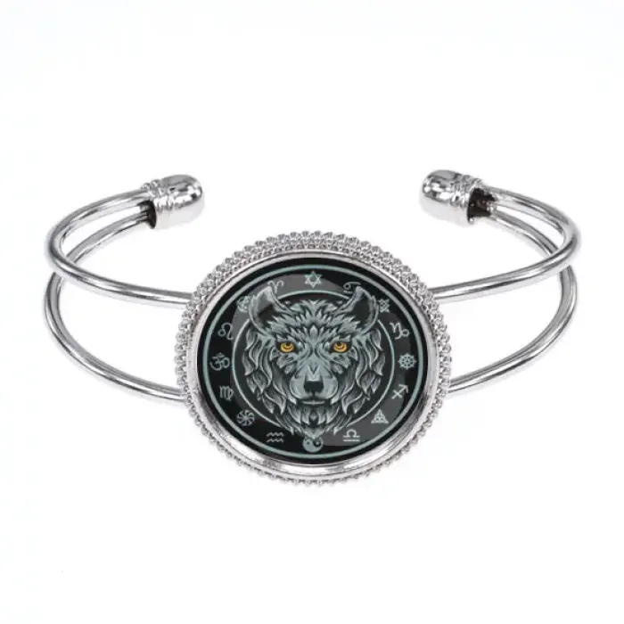 Браслет из бижутерного сплава с изображением волка под выпуклой стеклянной линзой.