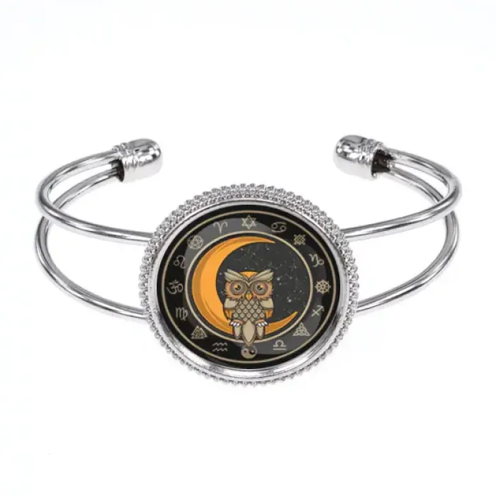 Браслет с изображением совы на месяце. Материал — бижутерный сплав с покрытием под серебро и стекло.