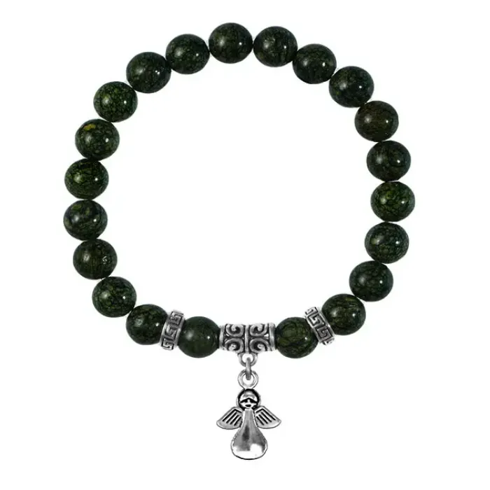Браслет из натурального камня змеевик с подвеской-талисманом в виде ангела-хранителя.