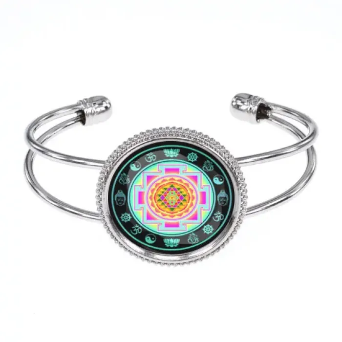 Этот браслет с изображением Шри-янтры является не только стильным аксессуаром, но и символом гармонии и духовного баланса. Изготовленный из бижутерного сплава с покрытием под серебро и дополненный стеклянной линзой, он защищает изображение диаметром 25 мм от повреждений. Открытая форма браслета делает его универсальным для любого запястья, а упаковка в прозрачный пакет добавляет удобства при хранении или подарке. Браслет традиционно ценится за свою красоту и глубокий смысл, что делает его идеальным выбором для тех, кто ищет нечто большее, чем просто украшение.