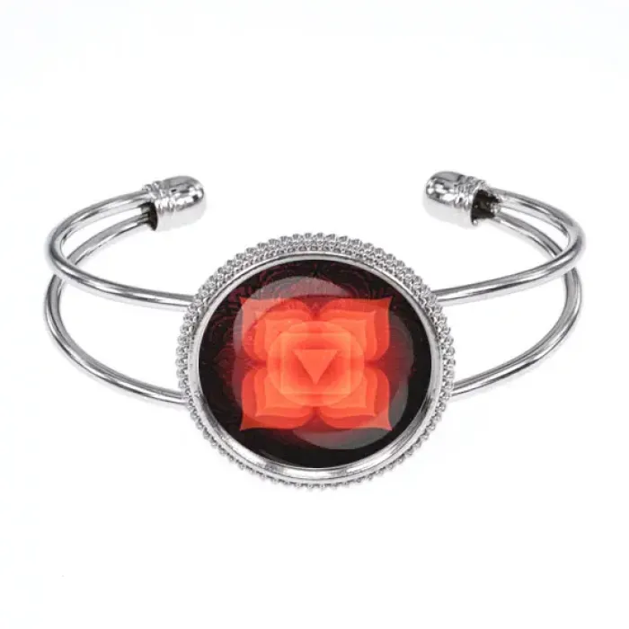 Браслет с изображением Муладхара чакры. Изготовлен из бижутерного сплава со стеклянным вставным элементом.