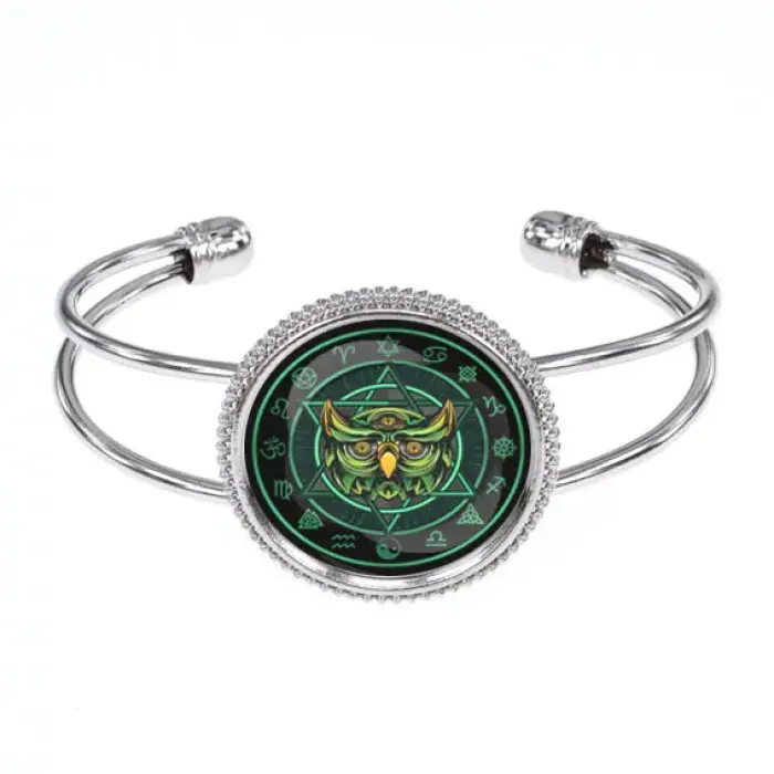 Браслет с изображением совы. Изготовлен из бижутерного сплава со стеклянной вставкой.