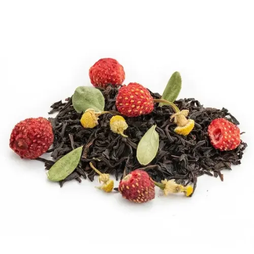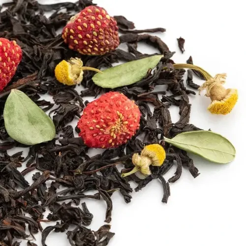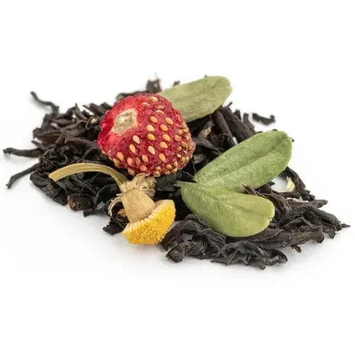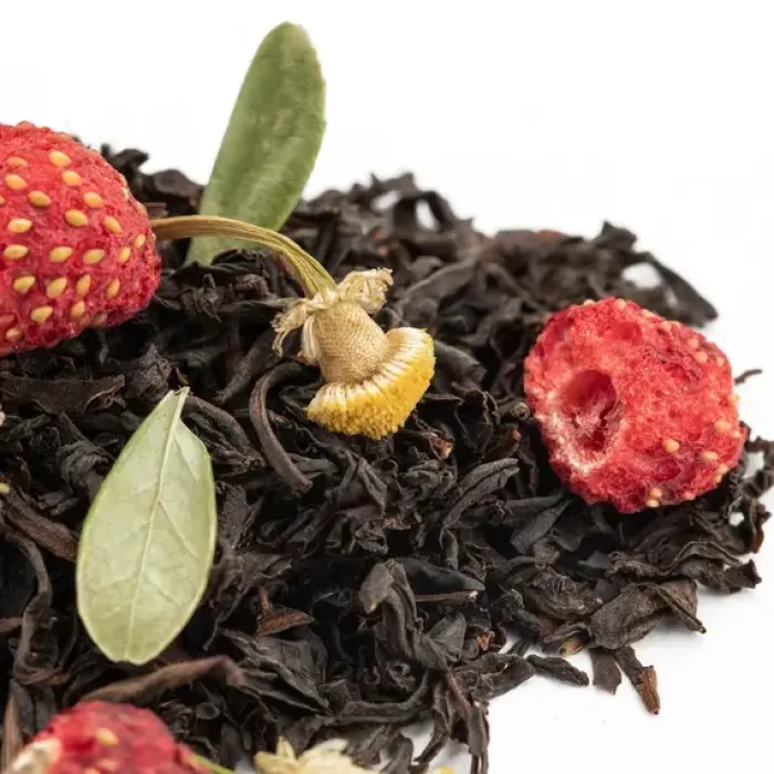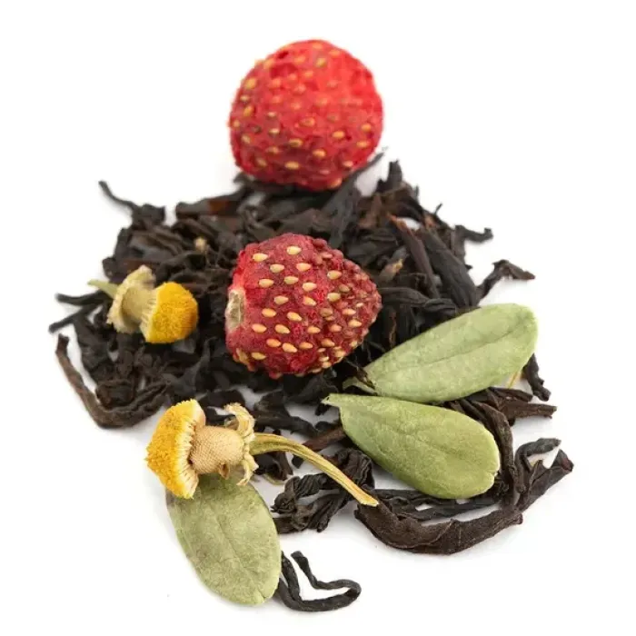 Этот ароматизированный чёрный чай создаёт образ летнего леса, сочетая насыщенную основу индийского листа со сладостью земляники и травяными оттенками ромашки и брусники. Настой получается глубоким и тёмным, с нежным, но выразительным ароматом.
