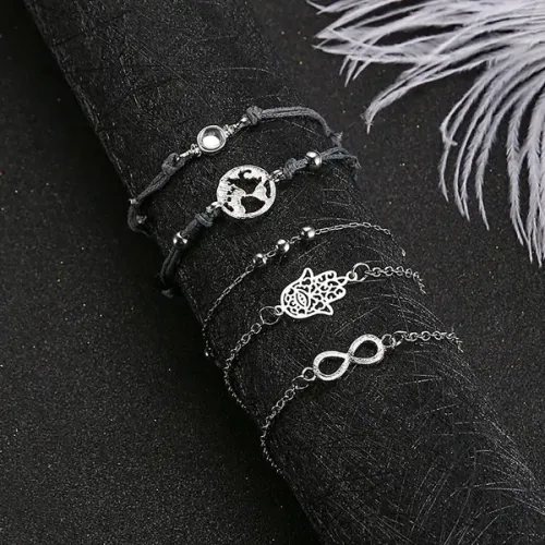 Набор из пяти браслетов для ношения, выполненных из бижутерного сплава с серебряным покрытием. Включает браслеты на цепочке и на нити.