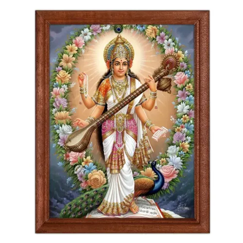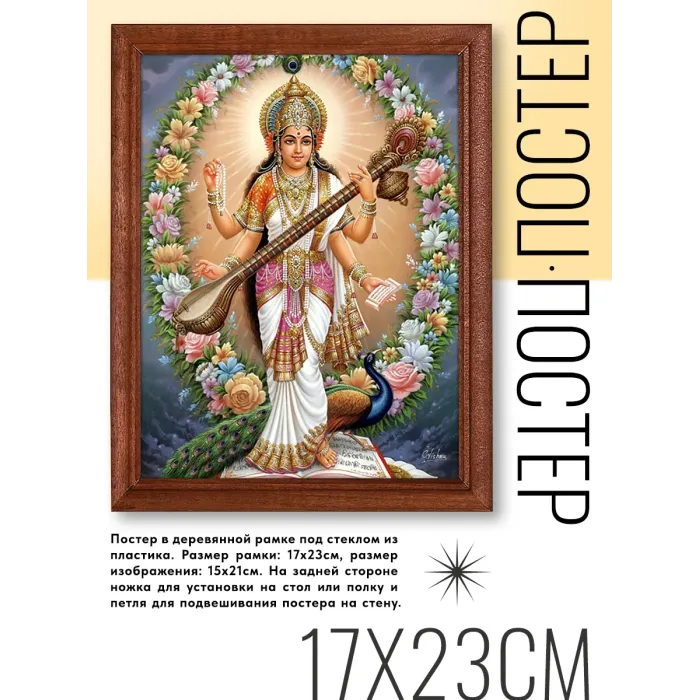 Постер в рамке с изображением богини Сарасвати. Рама деревянная, с ножкой для установки на поверхность и петлёй для настенного крепления.