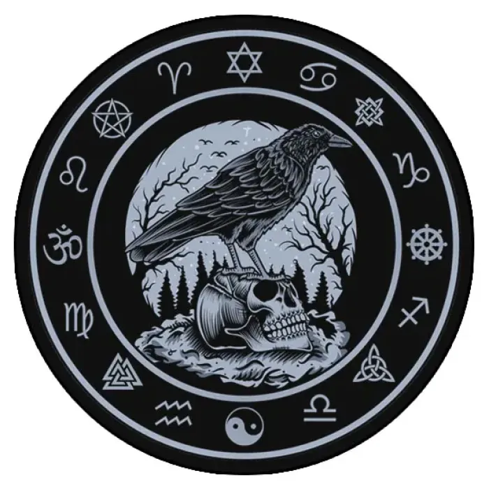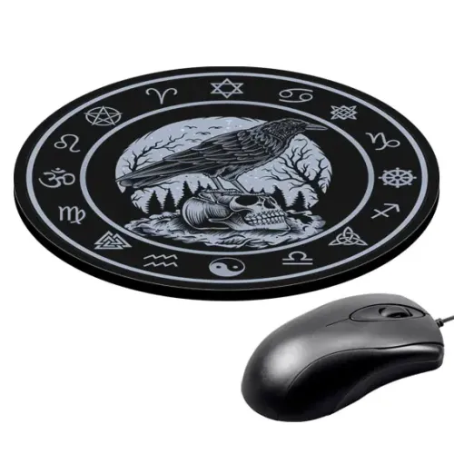 Коврик для компьютерной мыши круглой формы с изображением ворон на черепе.