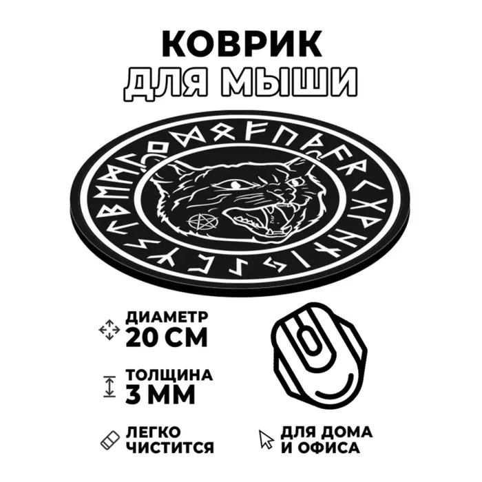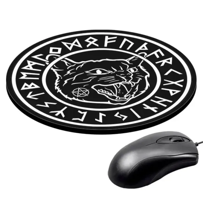 Коврик для компьютерной мыши круглой формы с изображением чёрного кота.
