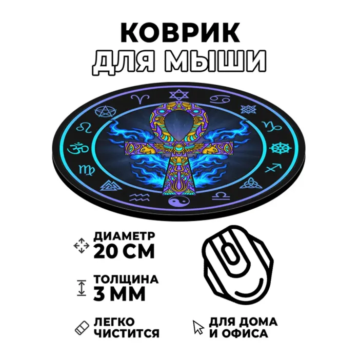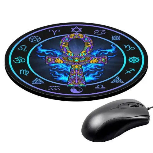 Коврик для компьютерной мыши круглой формы с нанесённым изображением древнеегипетского символа Анкх.